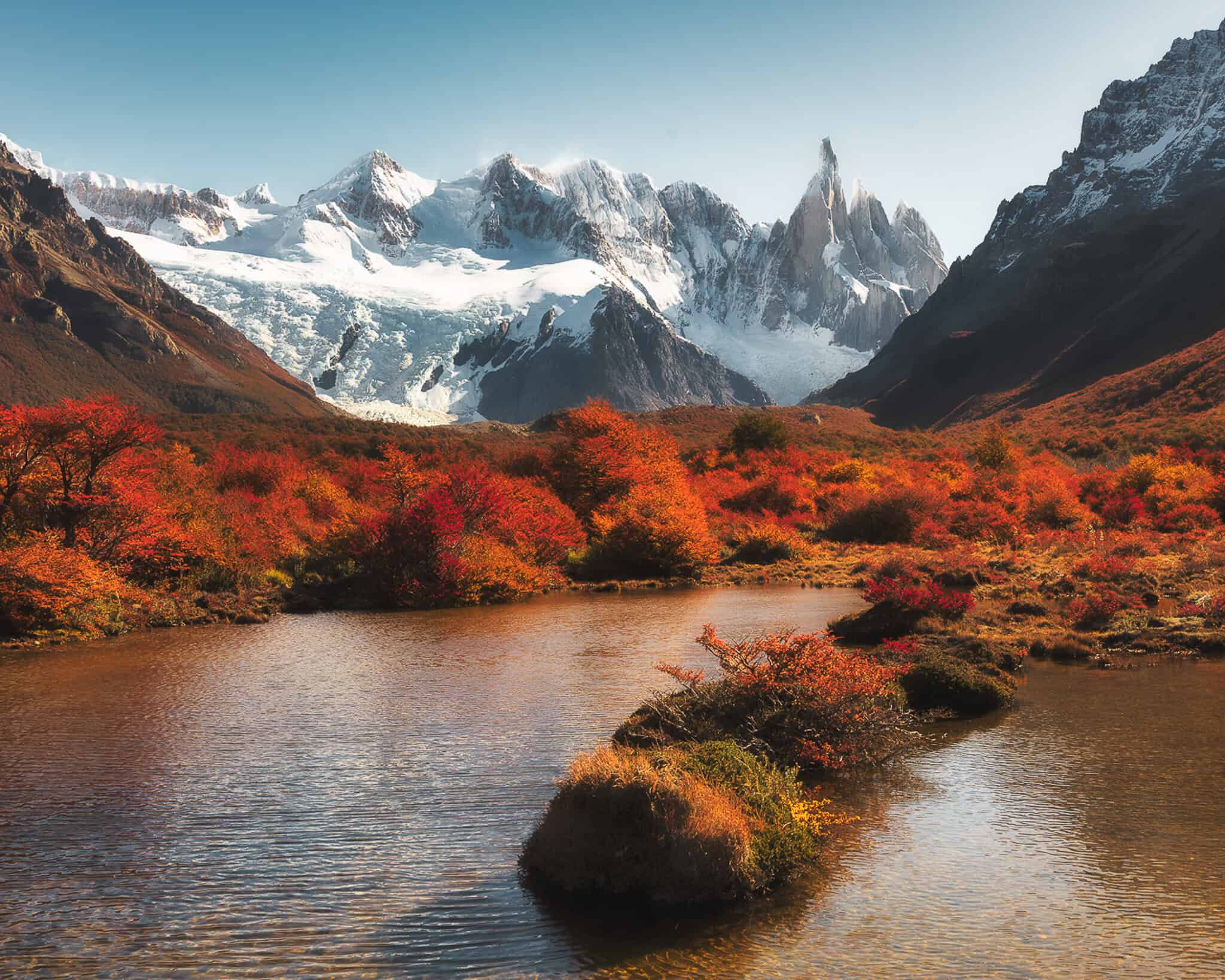 El otoño transforma a El Chaltén en uno de los escenarios más fotogénicos del planeta. Los bosques de lengas se tiñen de rojos, naranjas y amarillos intensos, el aire es más estable, las montañas suelen regalar cielos limpios y la Patagonia se muestra en todo su esplendor.